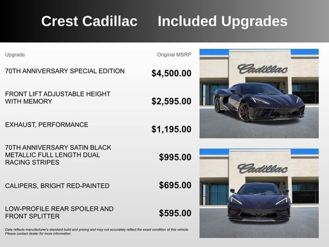 Experience the Pinnacle of American Performance: The 2023 Chevrolet Corvette Stingray Convertible 3LT 70th AnniversaryPrepare to be captivated by the stunning 2023 Chevrolet Corvette Stingray Convertible 3LT 70th Anniversary. This iconic sports car has been meticulously crafted to deliver an unparalleled driving experience, blending timeless style with cutting-edge technology.- 70th Anniversary Satin Black Metallic Full Length Dual Racing Stripes- Front Lift Adjustable Height with Memory- Bright Red-Painted Calipers- Black Exhaust Tips- Performance Exhaust with Stainless-Steel Tips- Low-Profile Rear Spoiler and Front SplitterBeneath the sleek exterior lies a heart-pounding 6.2L V8 engine, mated to an 8-Speed Dual Clutch transmission, delivering an exhilarating 480 horsepower and 470 lb-ft of torque. With a remarkable 16 city/24 highway MPG, you'll enjoy exceptional performance without sacrificing efficiency.Step inside the 70th Anniversary Special Edition and experience the height of luxury. The Napa leather seating surfaces with perforated inserts and Torch Red seat belts create an elegant and inviting cabin, while the Bose Performance Series sound system with 14 speakers delivers a concert-hall experience. The Chevrolet Infotainment 3 Premium system with navigation and wireless charging keep you connected and in control.Cutting-edge safety and driver assistance features, including Adaptive Cruise Control, Blind Spot Monitor, and Rear Cross Traffic Alert, provide added peace of mind. The Head-Up Display and Performance Data and Video Recorder further enhance the driver's experience, allowing you to track your performance and capture every thrilling moment.As a 70th Anniversary model, this Corvette Stingray Convertible 3LT is a true collector's item, with exclusive badging and design elements that celebrate the rich heritage of this legendary sports car. With only 980 miles on the odometer, this pristine example is a rare find, offering the opportunity to own a piece of Corvette history.Prepare to turn heads and leave a lasting impression wherever you go. Experience the pinnacle of American performance in the 2023 Chevrolet Corvette Stingray Convertible 3LT 70th Anniversary. Schedule your test drive today and discover the true meaning of driving passion.